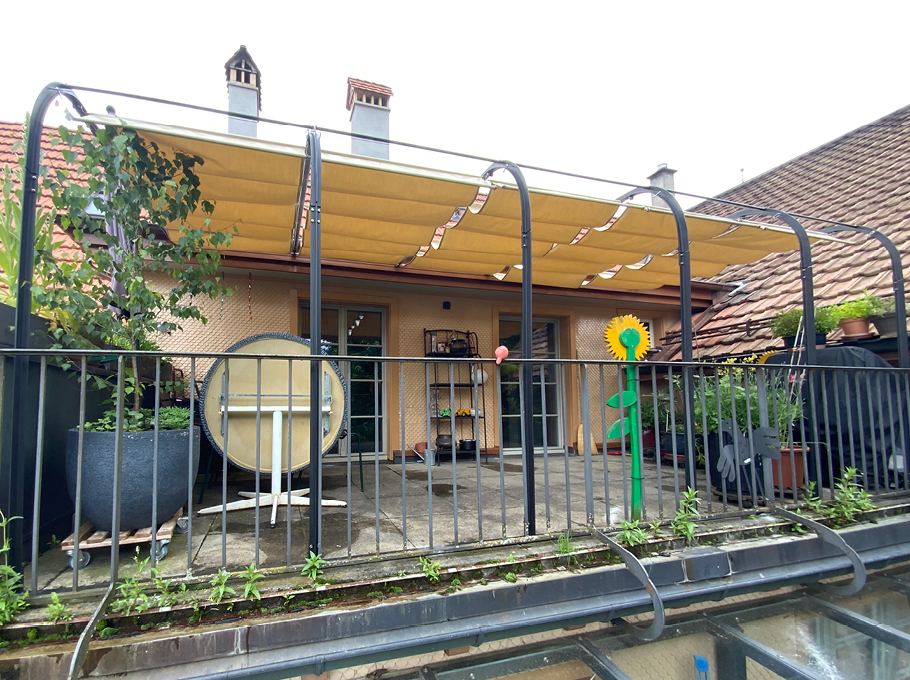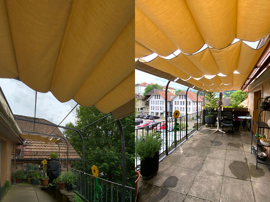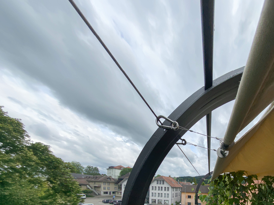 Stahlseil-Führungen für die Beschattungselemente, Raff- Beschattung mit UVbeständigem Storenstoff und Aluminiumrohrführungen.