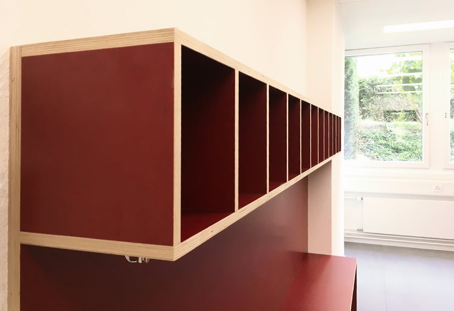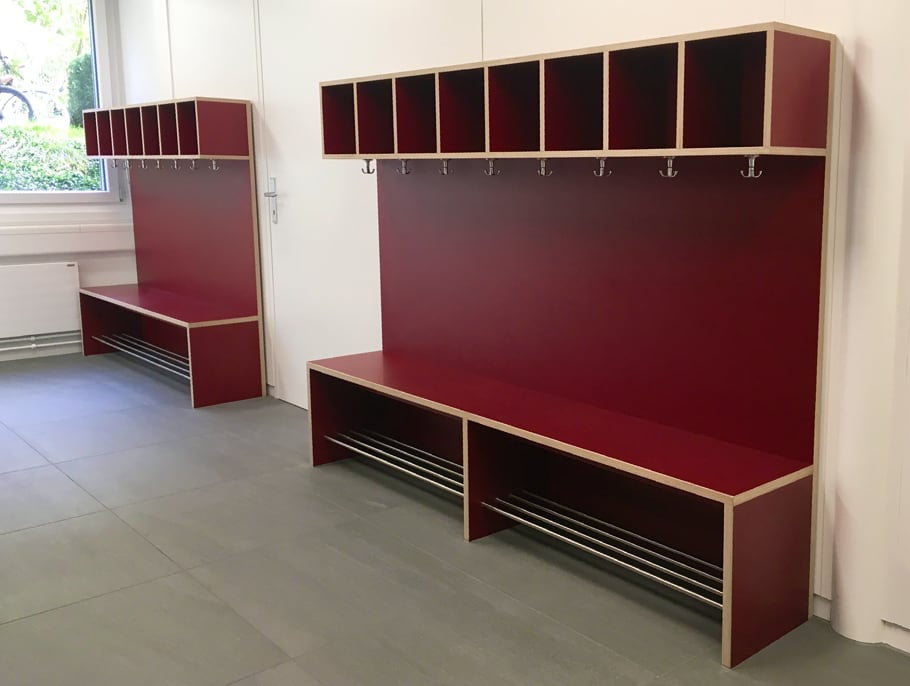 Material: Sperrholz bordeaurot beschichtet, div. Längen der Möbel