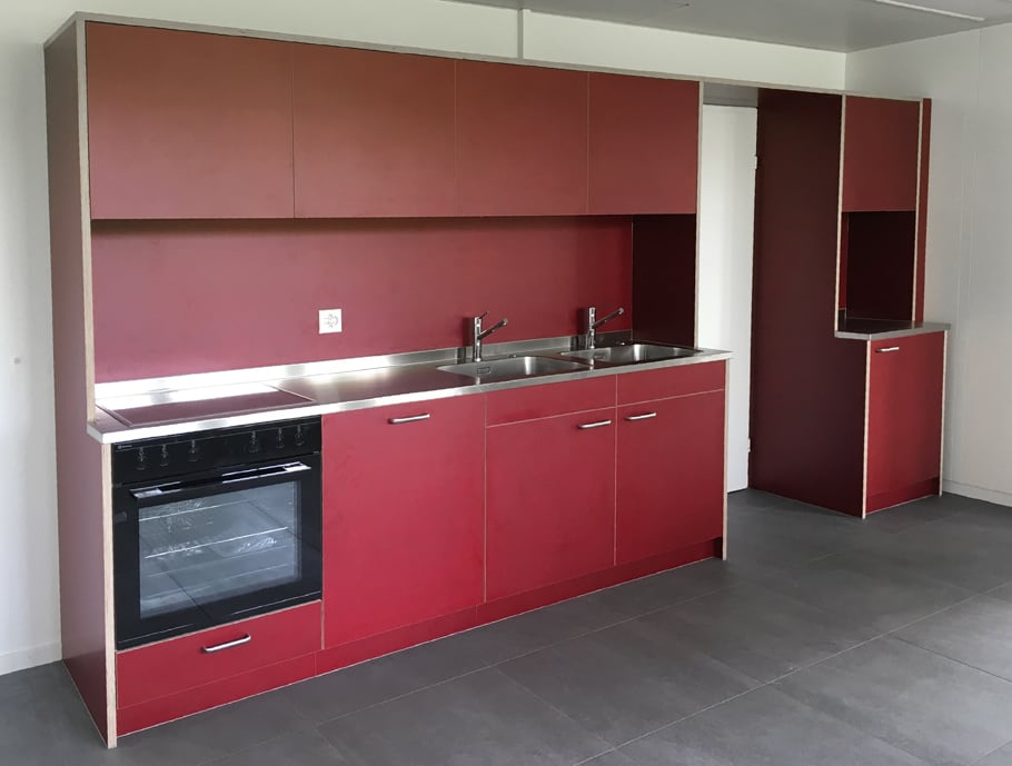 Material: Sperrholz bordeaurot beschichtet, inkl. Küchengeräte und CNS-Abdeckung