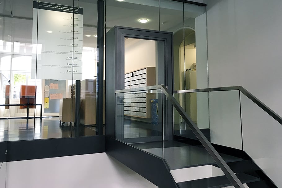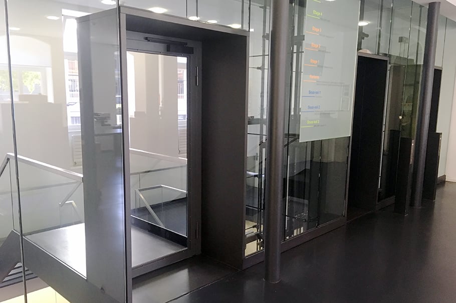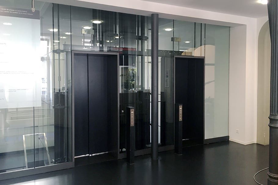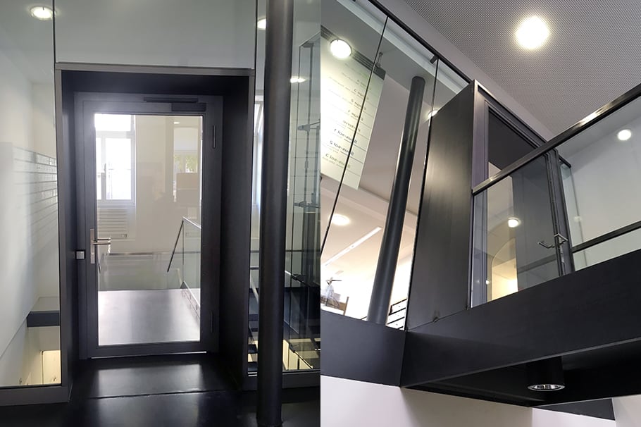 Verglasung mit verschiedenen Tür/Liftdurchgängen.