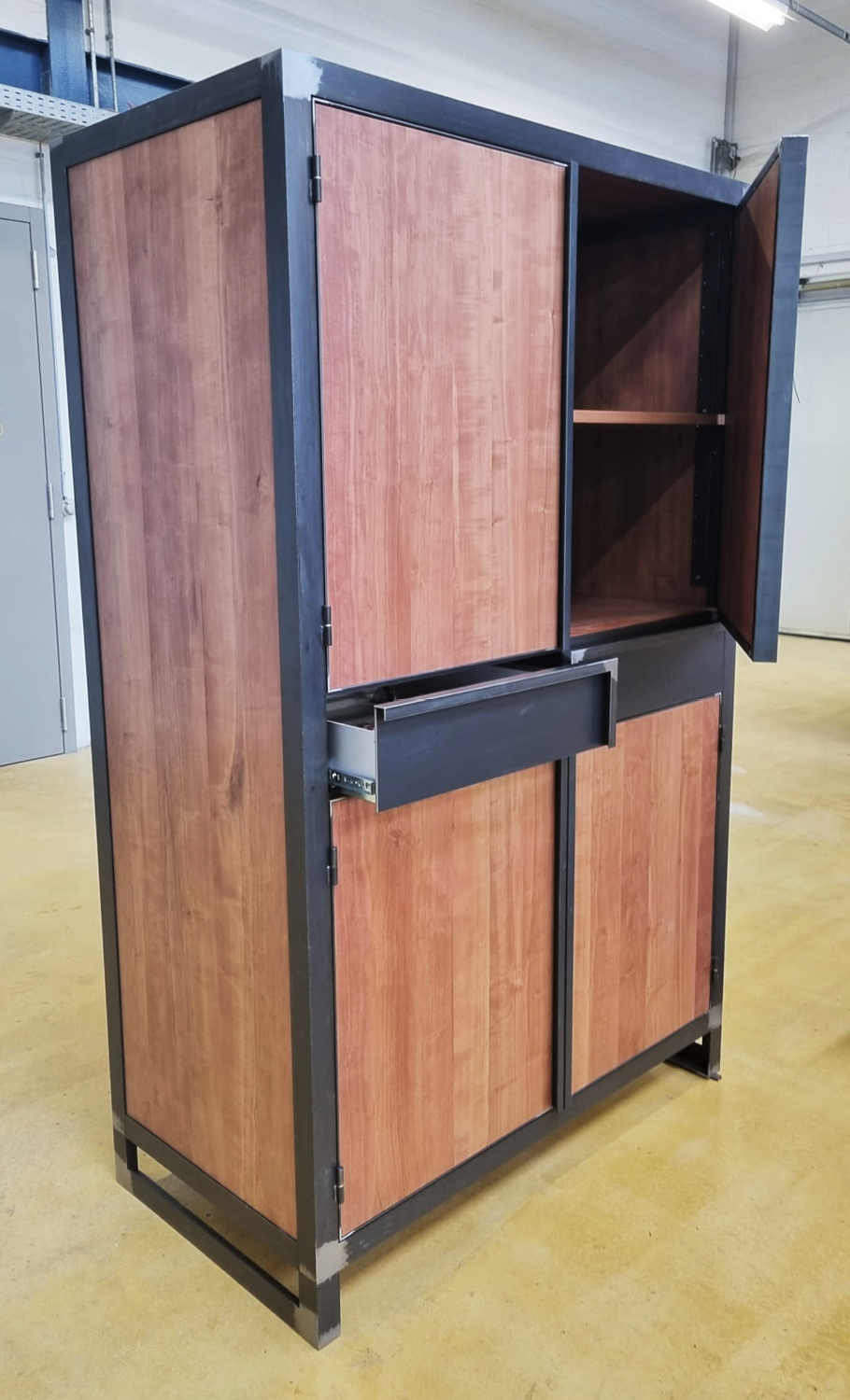 Kabinettschrank aus Winkelstahlprofil mit Massivholzeinlage Elsbeere, Ober- und Unterteil mit Schranktüren