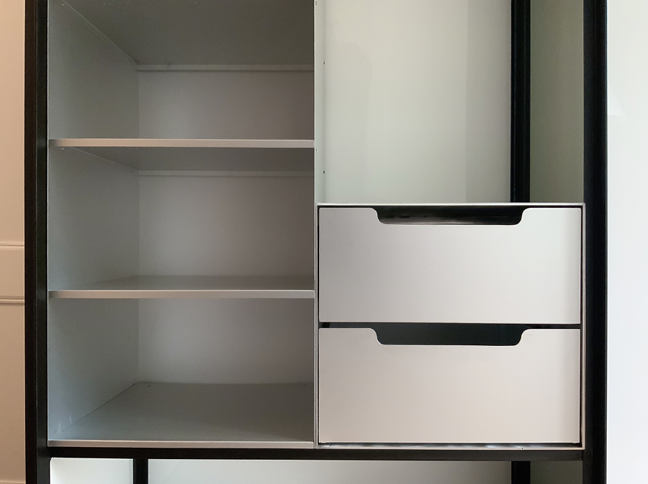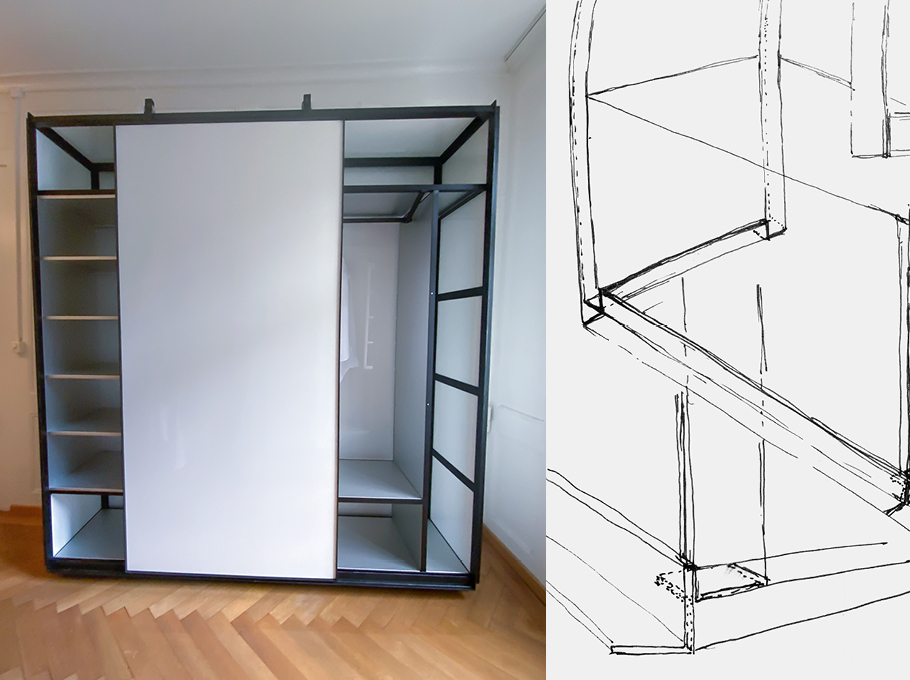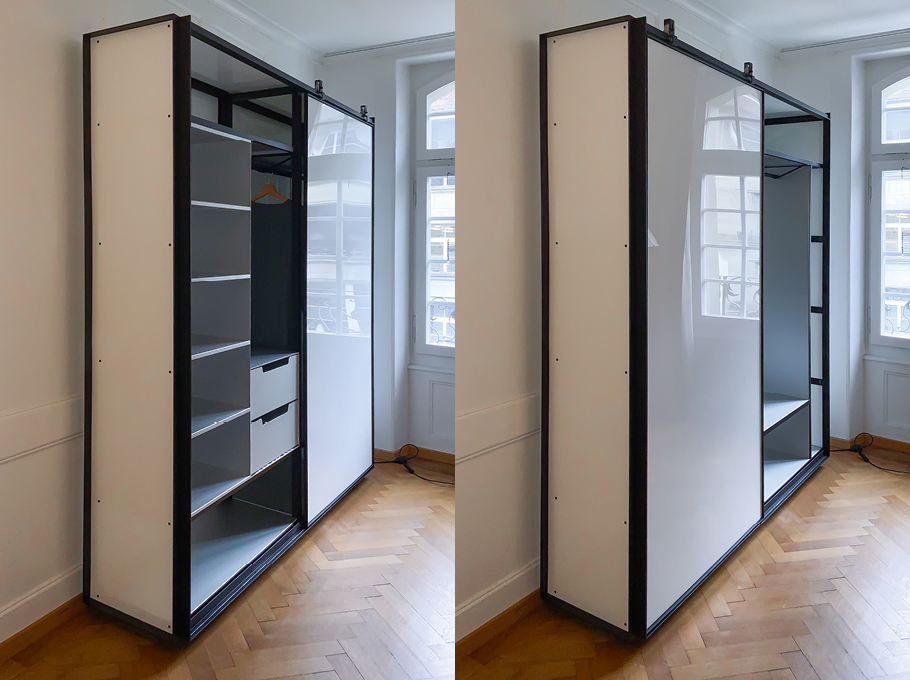 Objekt: Kleiderschrank aus Stahlwinkelprofil mit Schiebetür, Plexiglas-Inlays, eingebaute Schubladen- und Tablarkorpusse aus Aluminium