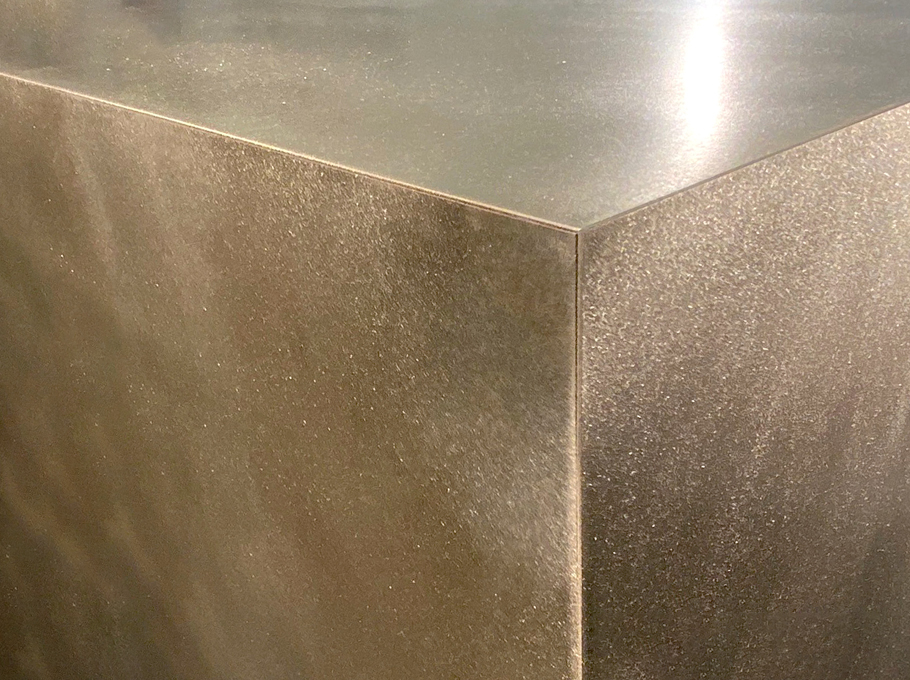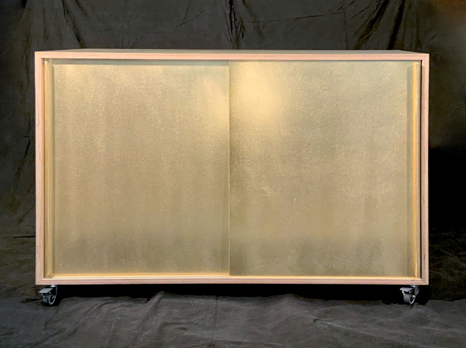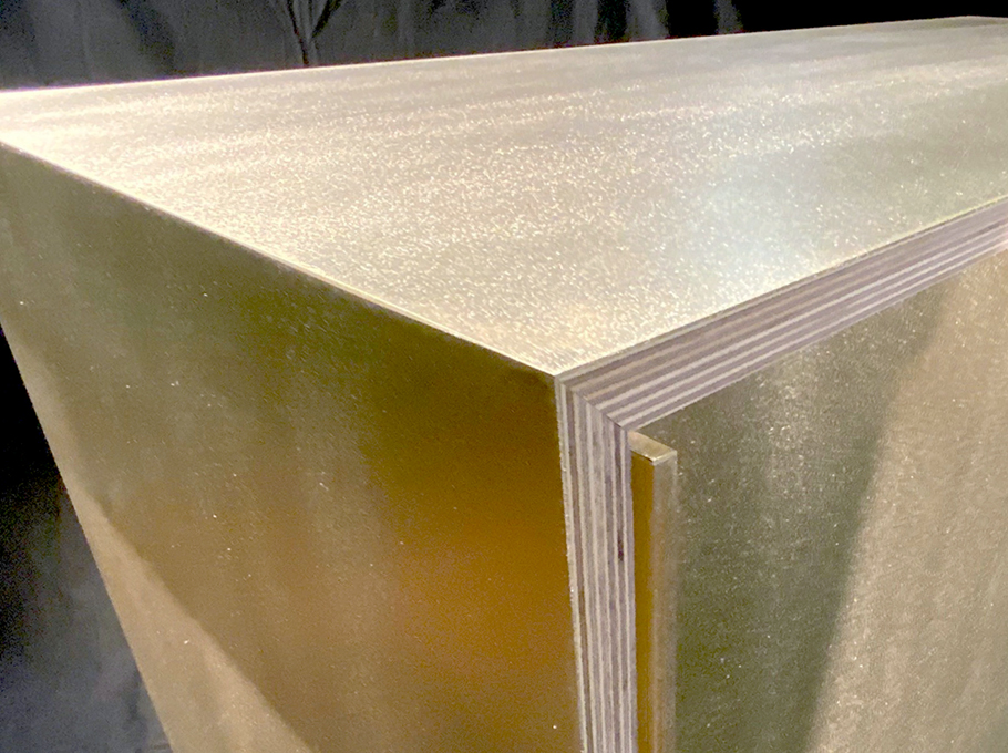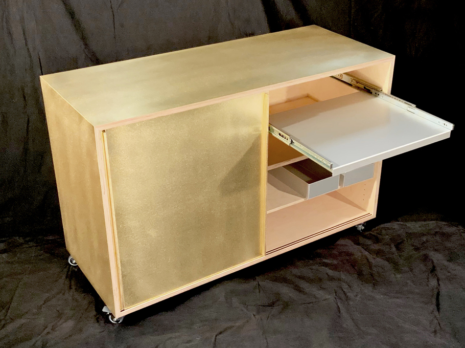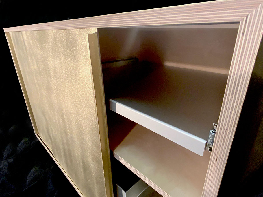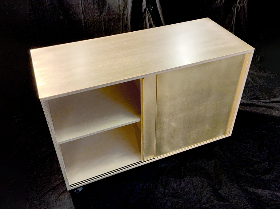 Sideboard-Korpus aus Birkensperrholz mit Messingblechfronten, Schiebetüren und Tablarauszug