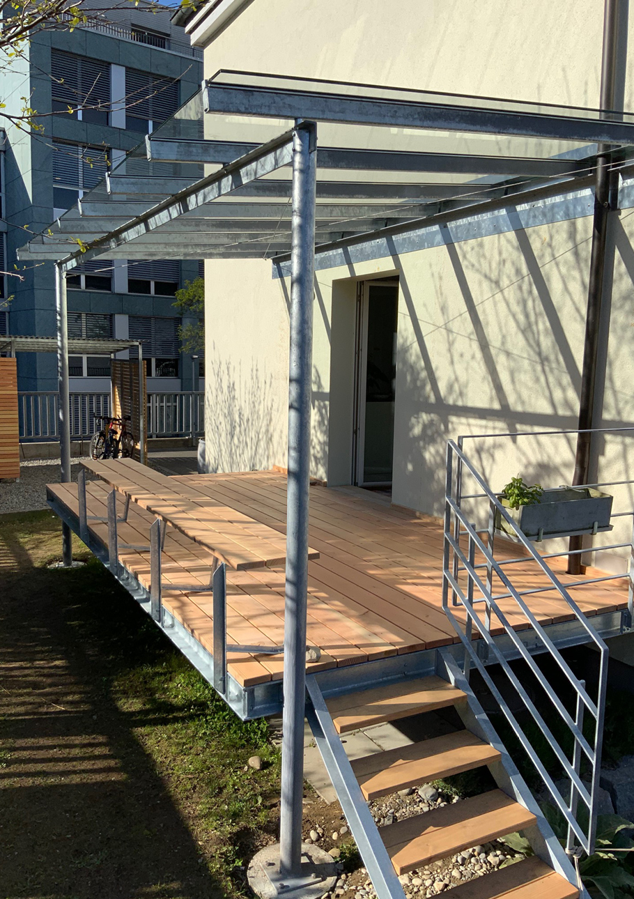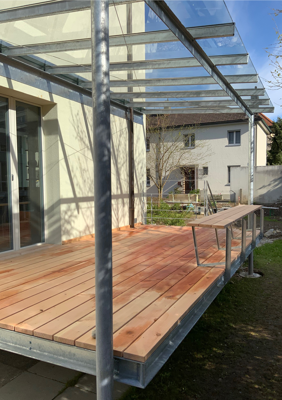 Planung und Ausführung einer Terrasse mit Glasdach, Stahlkonstruktion verzinkt. Terrassenboden, integrierte Bank, Treppenabgang und Verkleidung Garten/ Velohaus in Lärche Massiv