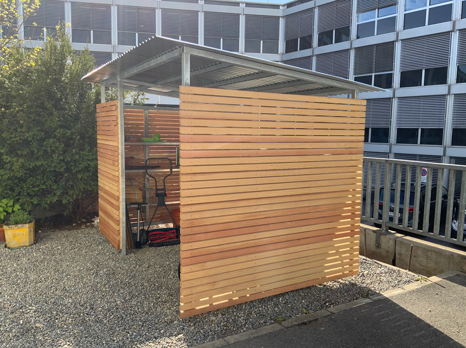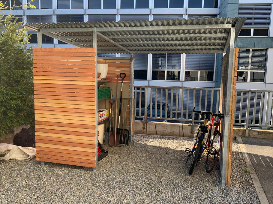 Terrasse mit Glasüberdachung, Garten/ Velohaus