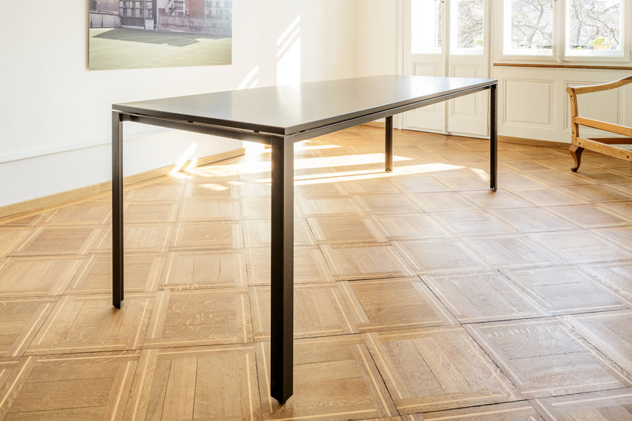 Material: Tischblatt aus Birkensperrholz, geschliffen, geölt mit schwarzanthrazit Pigmentierung, versiegelt, Untergestell Stahl schwarz geölt Maße: L_2400 x B_800 x H_740 mm