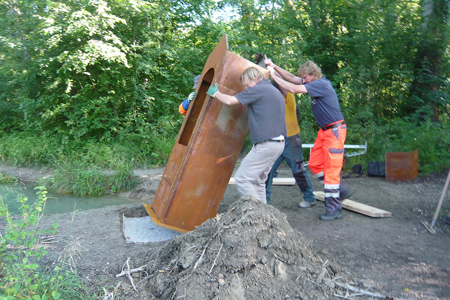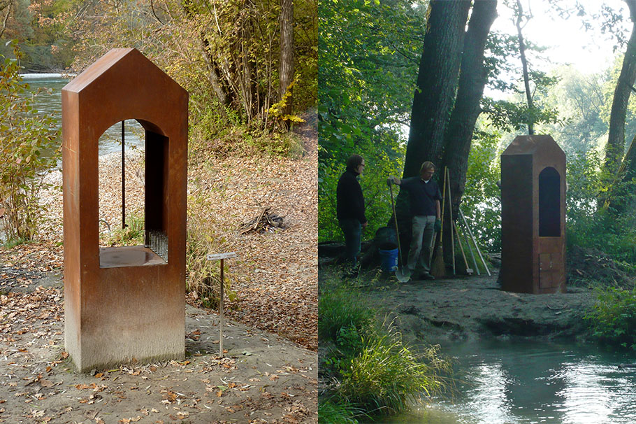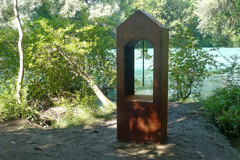 Wasser ist Leben, Wasser ist Kraft – Das Wasserhüsli soll Menschen einladen innezuhalten, Quellwasser zu trinken, Gedanken auszutauschen, kurzum, sich zu besinnen, sich zu erfrischen und sich zu begegnen. Das Wasserhüsli, aus unbehandeltem Stahlblech, verschweisst und verschraubt, bietet Passanten/innen auch die Möglichkeit ihre Gedanken ins Blech einzuritzen, was andere animieren soll eingeritzte Gedanken zu ergänzen, zu erweitern.